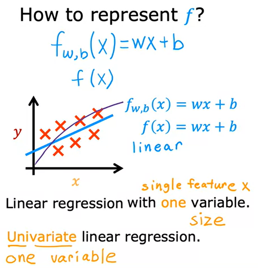 - f_wb = f(x) = wx + b ( w,b : parameters, Coefficients, weights) (w = slope(기울기) , b = intercept(절편))