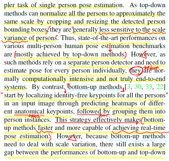 이전 bottom-up 방식은 keypoint를 grouping하는데 초점을 맞춰왔고 입력이미지의 1/4 해상도의 단일해상도 Feature map을 사용하였다. 이러한 방식은 Scale variation의 문제점을 해결하지 못하였고, Image pyramid의 결과에만 의존하게 되었다.