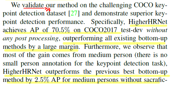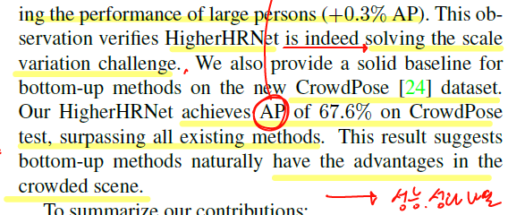 HigherHRNet의 성능을 나타내는 문단이며, COCO 데이터셋에서 70.5%의 AP를, 다른 bottom-up방식보다 좋은 퍼포먼스를 보여주었다. 더나아가 크기가 큰 사람들의 인식률도 낮추지 않고 가장 좋은 결과를 얻었다는 것이 주목할 만했다. 여러 군중들이 모여있는 CrowdPose내에서는 67.6%의 AP를 달성하였고, 이는 bottom-up방식이 군중에 효과가 있다는 것을 나타내었다.