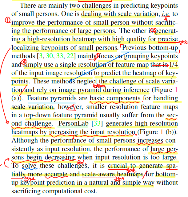 PersonLab에서 입력이미지의 해상도를 높임으로써 고해상도의 히트맵을 얻어냈고 이는 원하는 결과는 얻어냈지만, Large person에 대한 성능이 감소해버렸다. 따라서 이런 문제를 해결하기 위해 bottom-up 방식을 위한 공간적으로 더 정확하고 scale-aware한 히트맵을 만드는 것이 중요하게 되었다.