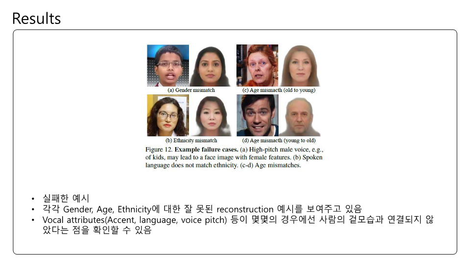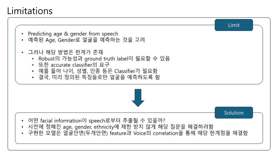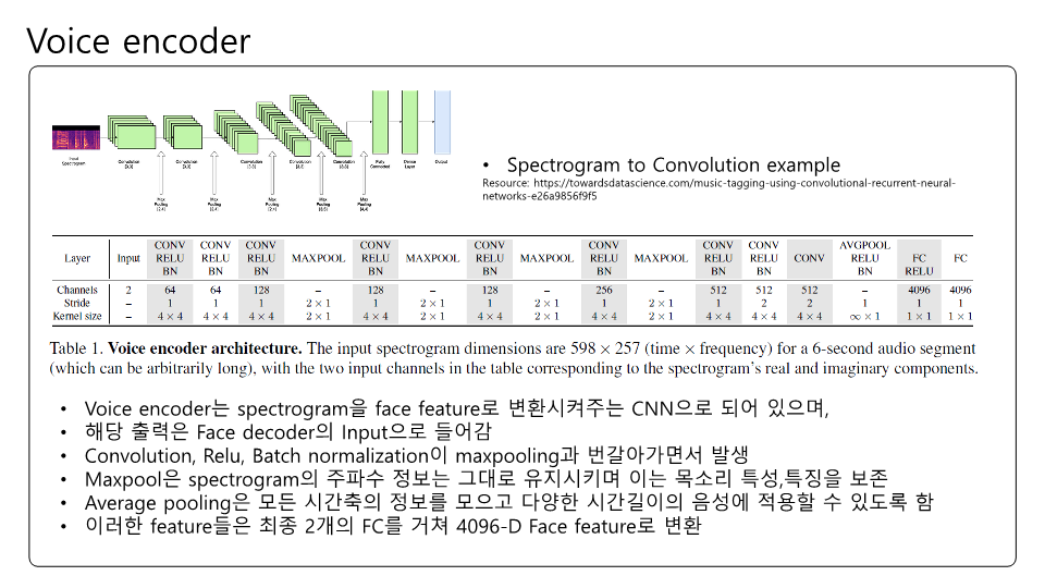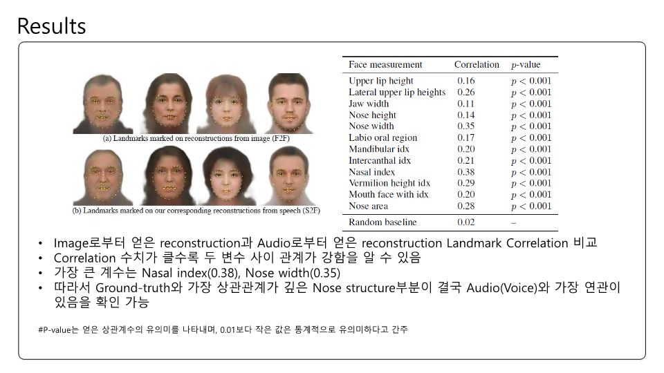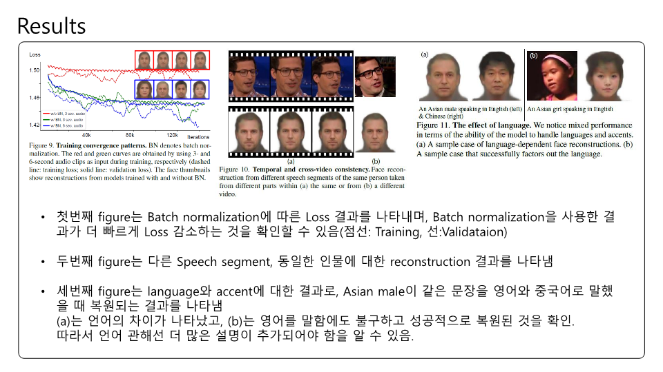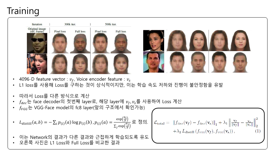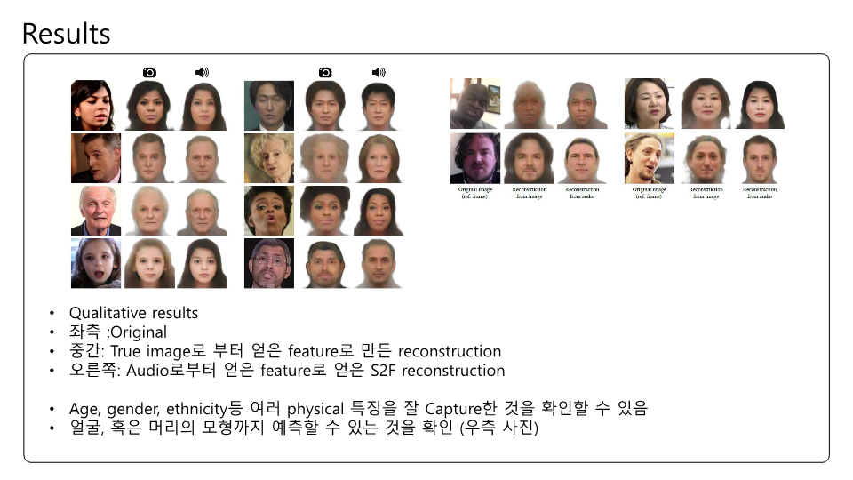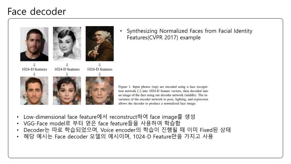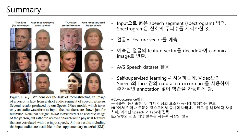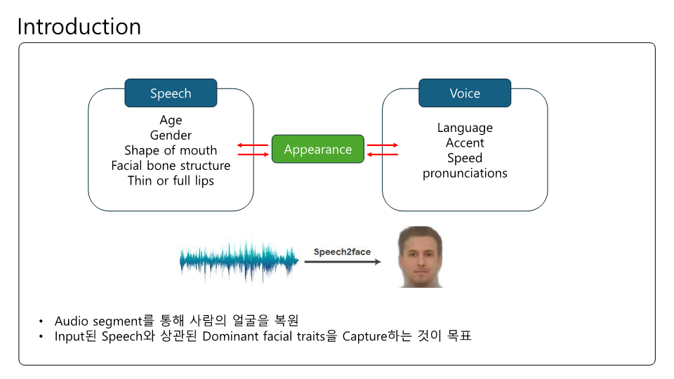 Speech2Face에 대해 논문을 읽고 제가 이해한대로 정리하여 PPT로 만들어보았습니다. 이번 논문 또한 Multi-modal에 관한 논문인데 실험결과에 대한 얘기가 많고 Training이나 내부 pipeline에 대한 설명은 간단한 것 같았습니다. Transformer구조가 안들어가서 그런 것 같기도하고요. 목소리를 통해서 얼굴을 복원한다는것이 평소에 우리가 어떤 사람 목소리를 듣고 해당 사람의 얼굴을 떠올린다는 점에서 매커니즘이 비슷한거 같아 정말 '지능' 같다는 생각이 들었습니다.