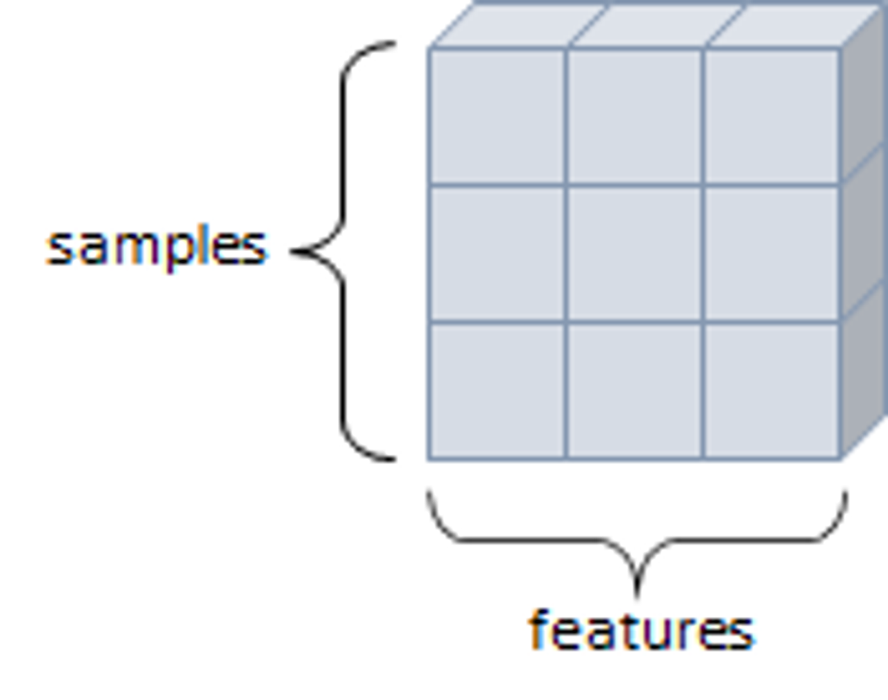 - 행렬과 같은 모양, 두개의 축이 존재. 일반적인 수치와 통계 데이터셋이 해당, 샘플과 특성을 가진 구조로 사용